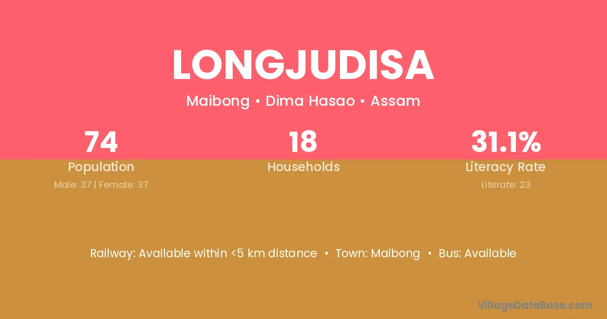 Longjudisa village has a total population of 74 people, of which 37 are males and 37 are females.
