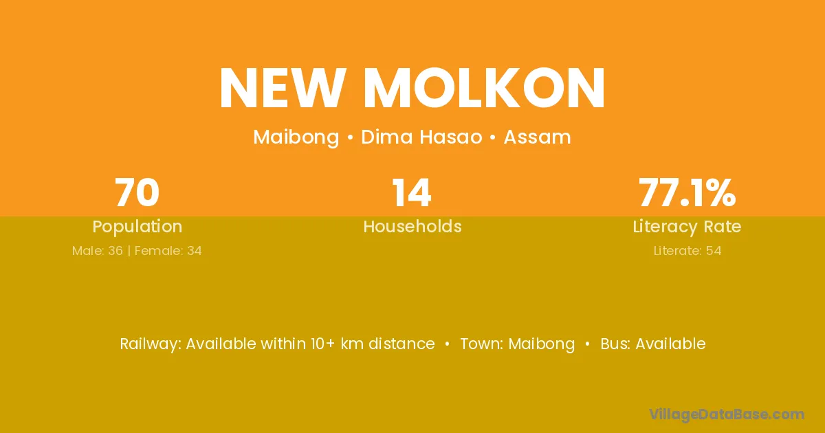 New Molkon village has a total population of 70 people, of which 36 are males and 34 are females.