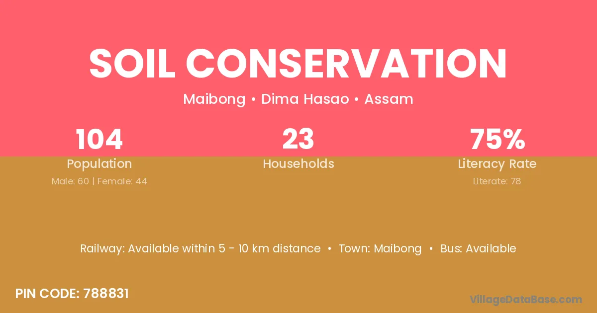 Soil Conservation village has a total population of 104 people, of which 60 are males and 44 are females.