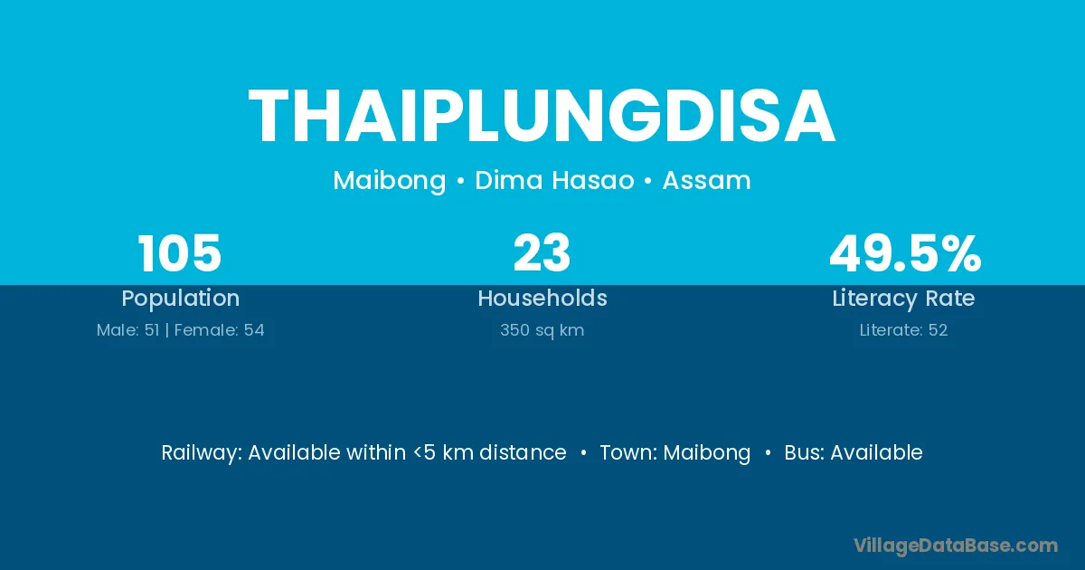 Thaiplungdisa village has a total population of 105 people, of which 51 are males and 54 are females.
