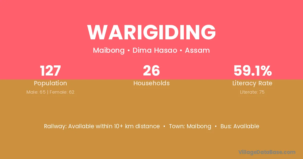 Warigiding village has a total population of 127 people, of which 65 are males and 62 are females.