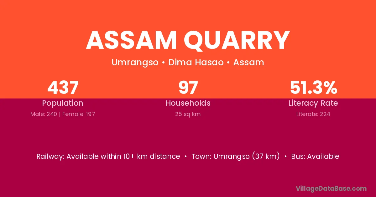 Umrangso (37 km) is the nearest town to Assam Quarry village for major economic activities and is located approximately 37 km away.