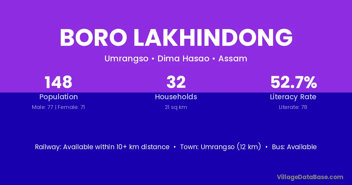 Umrangso (12 km) is the nearest town to Boro Lakhindong village for major economic activities and is located approximately 12 km away.