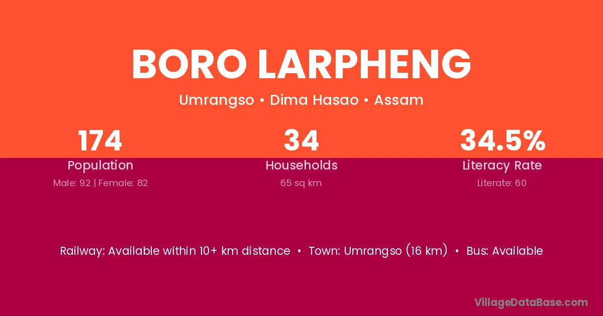 Umrangso (16 km) is the nearest town to Boro Larpheng village for major economic activities and is located approximately 16 km away.