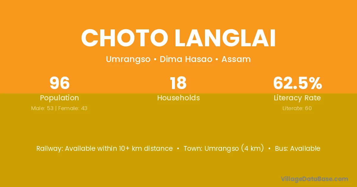 Umrangso (4 km) is the nearest town to Choto Langlai village for major economic activities and is located approximately 4 km away.