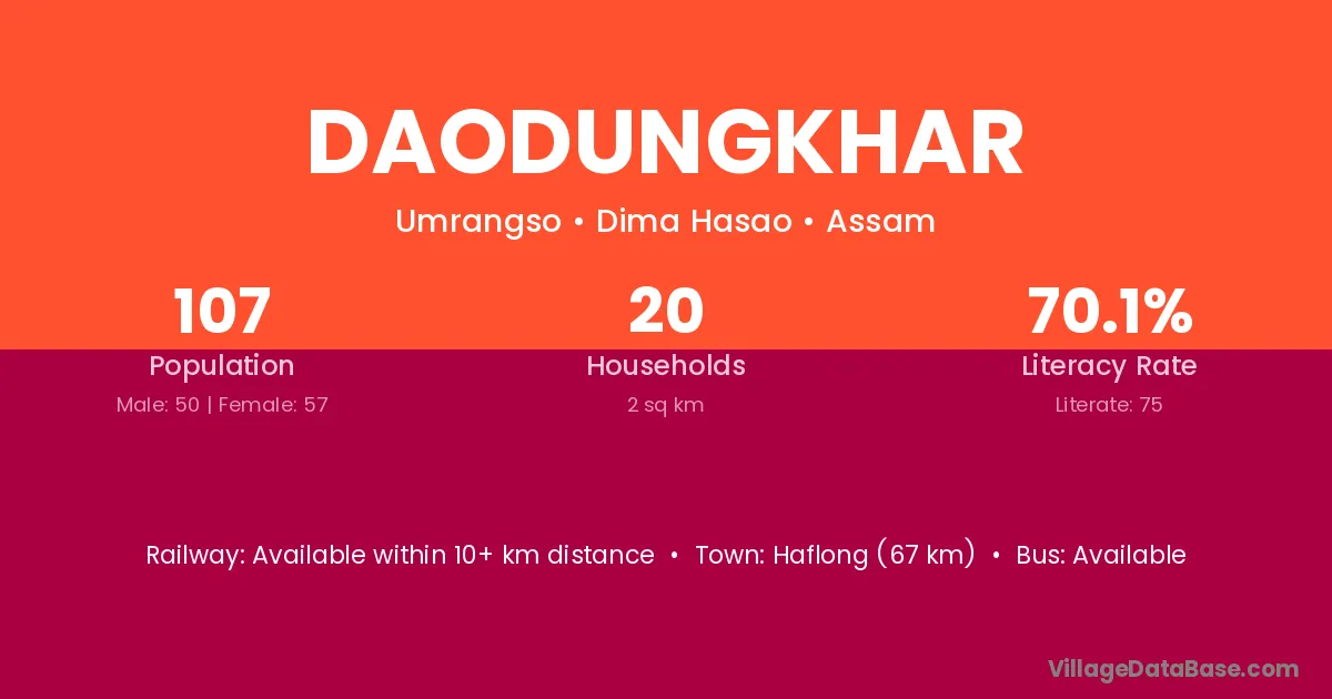 Haflong (67 km) is the nearest town to Daodungkhar village for major economic activities and is located approximately 67 km away.