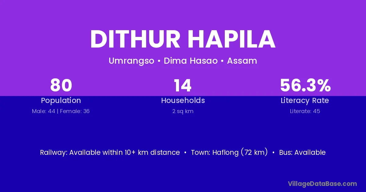 Haflong (72 km) is the nearest town to Dithur Hapila village for major economic activities and is located approximately 72 km away.