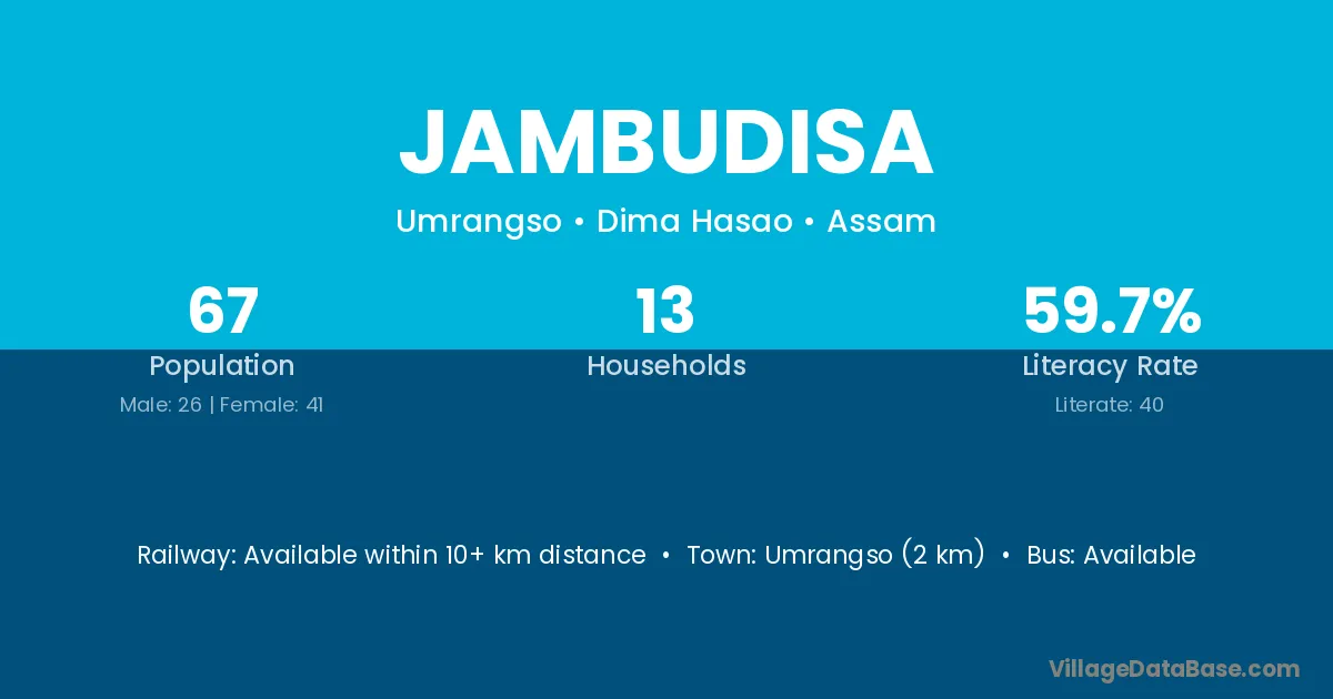 Umrangso (2 km) is the nearest town to Jambudisa village for major economic activities and is located approximately 2 km away.