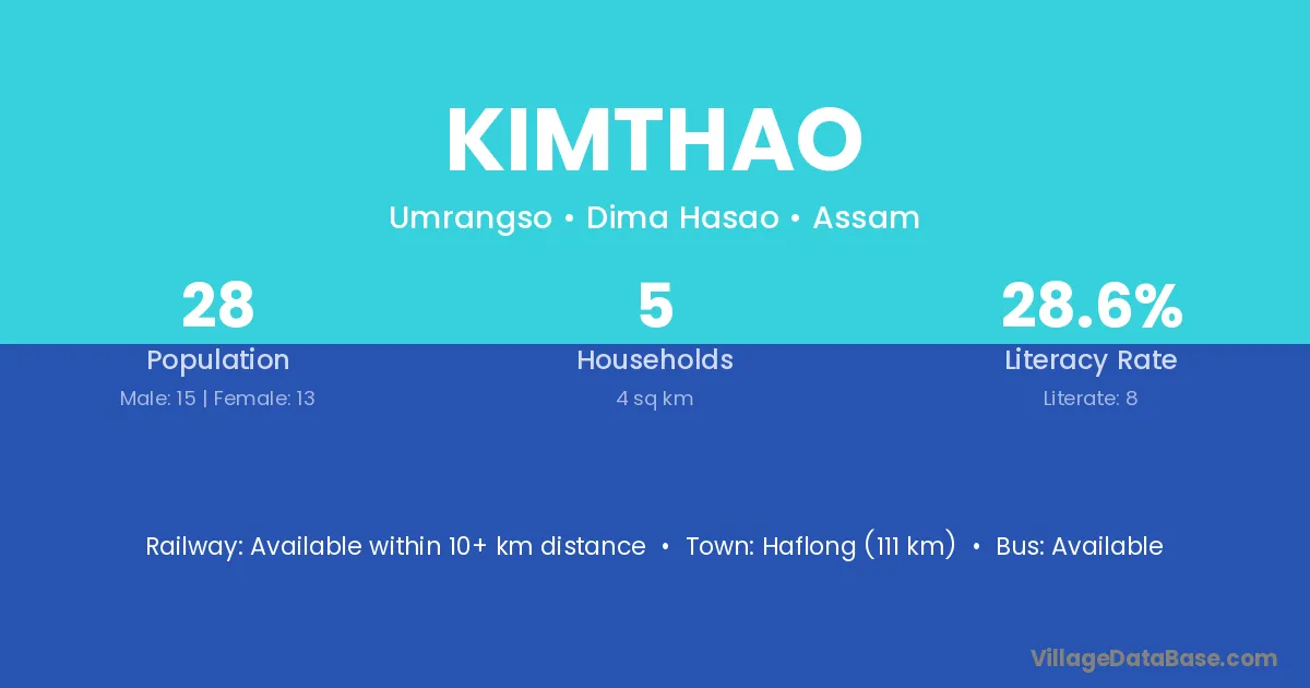 Haflong (111 km) is the nearest town to Kimthao village for major economic activities and is located approximately 111 km away.