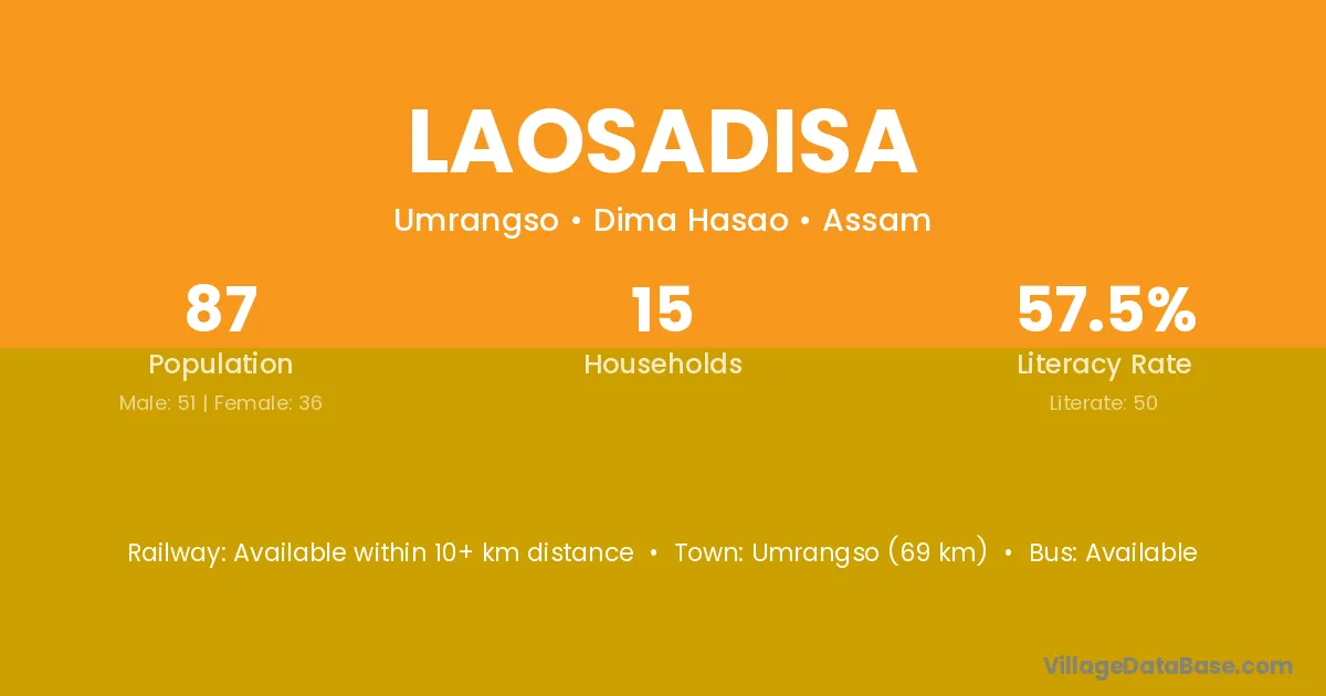 Umrangso (69 km) is the nearest town to Laosadisa village for major economic activities and is located approximately 69 km away.