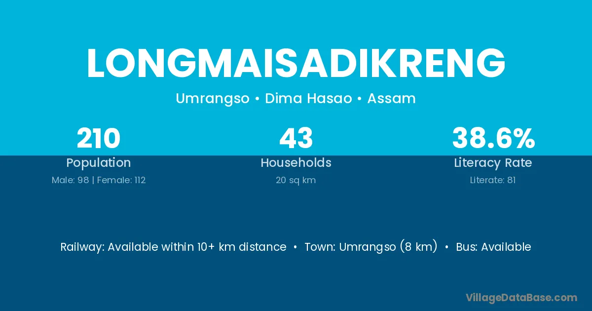 Umrangso (8 km) is the nearest town to Longmaisadikreng village for major economic activities and is located approximately 8 km away.
