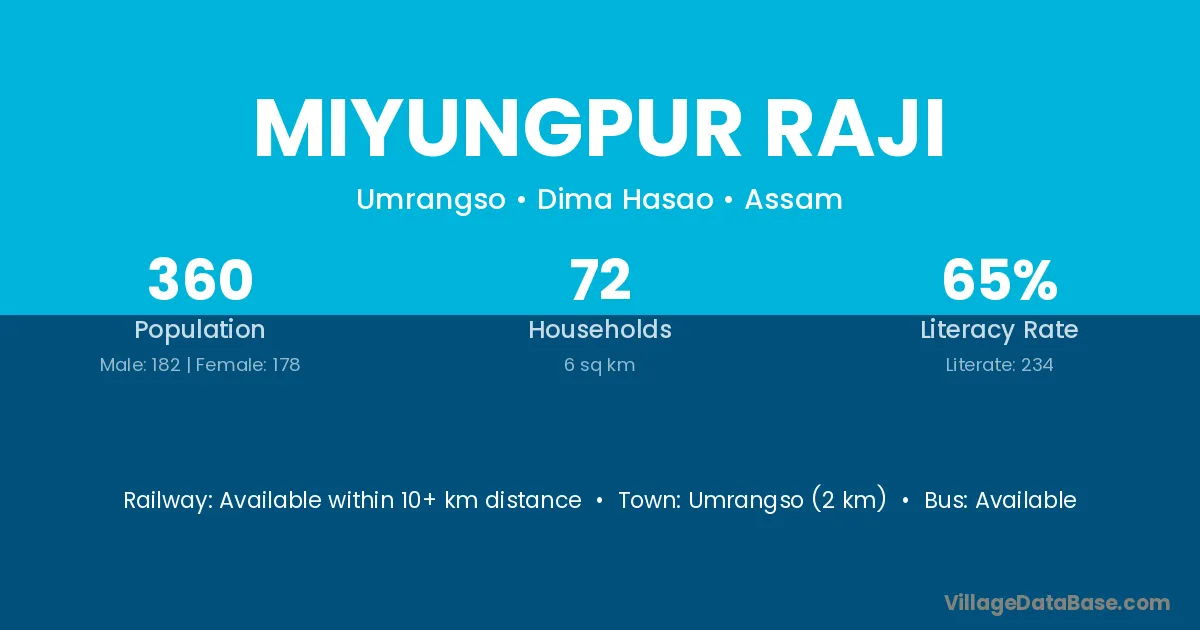 Umrangso (2 km) is the nearest town to Miyungpur Raji village for major economic activities and is located approximately 2 km away.