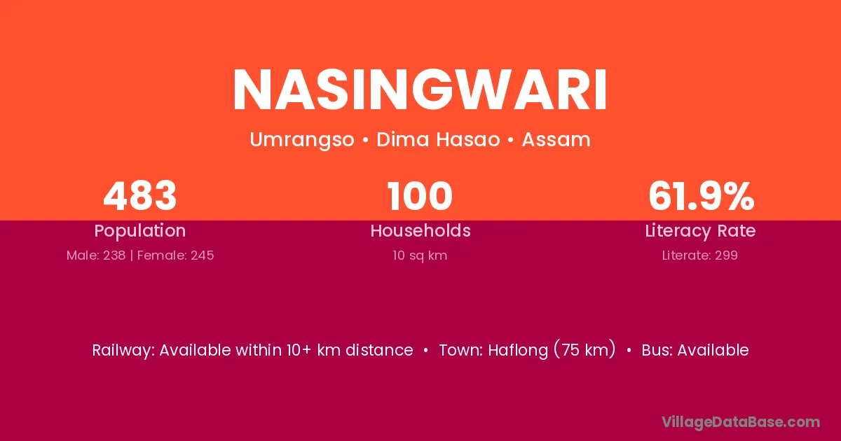 Haflong (75 km) is the nearest town to Nasingwari village for major economic activities and is located approximately 75 km away.