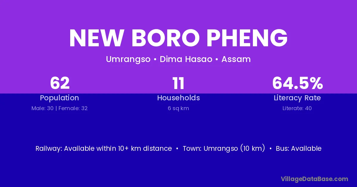Umrangso (10 km) is the nearest town to New Boro Pheng village for major economic activities and is located approximately 10 km away.