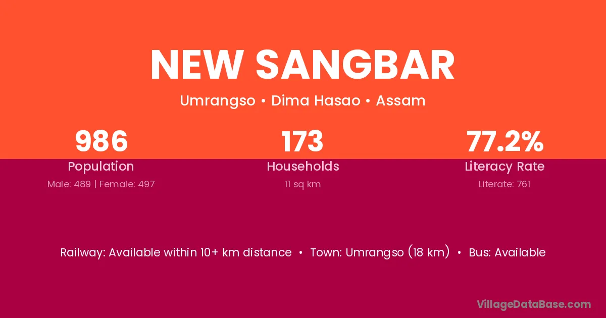 Umrangso (18 km) is the nearest town to New Sangbar village for major economic activities and is located approximately 18 km away.