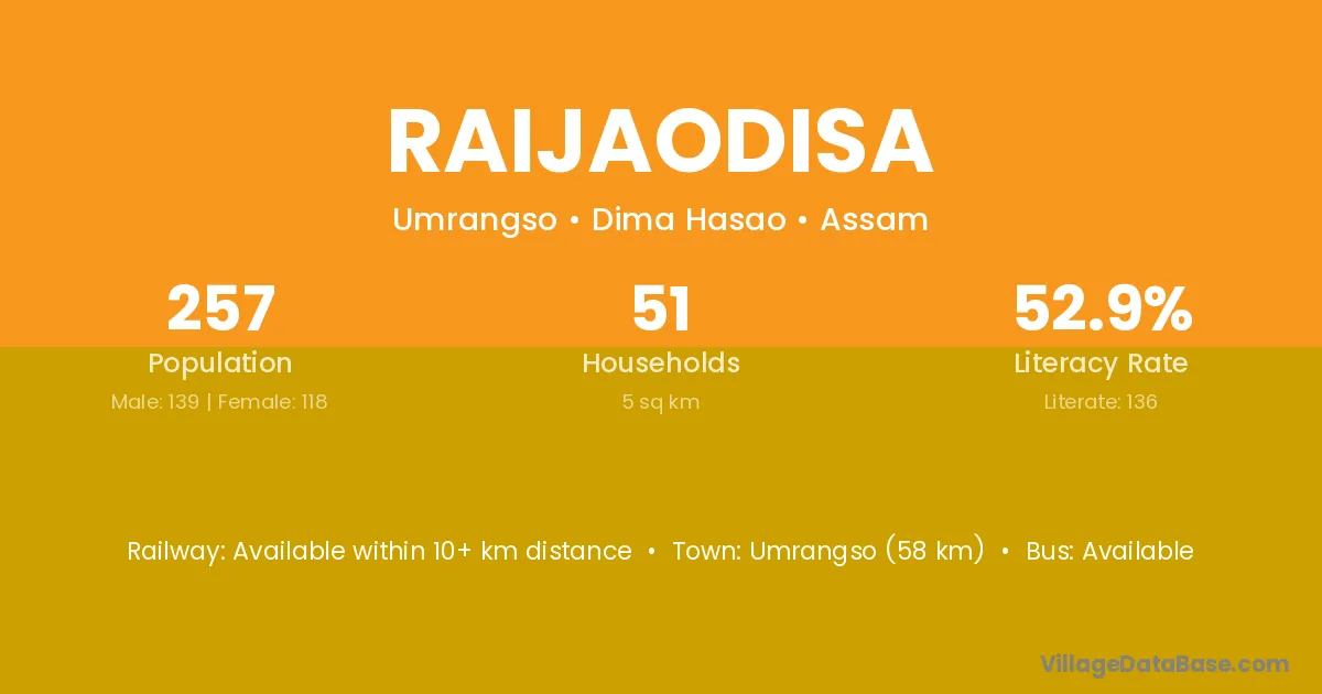 Umrangso (58 km) is the nearest town to Raijaodisa village for major economic activities and is located approximately 58 km away.