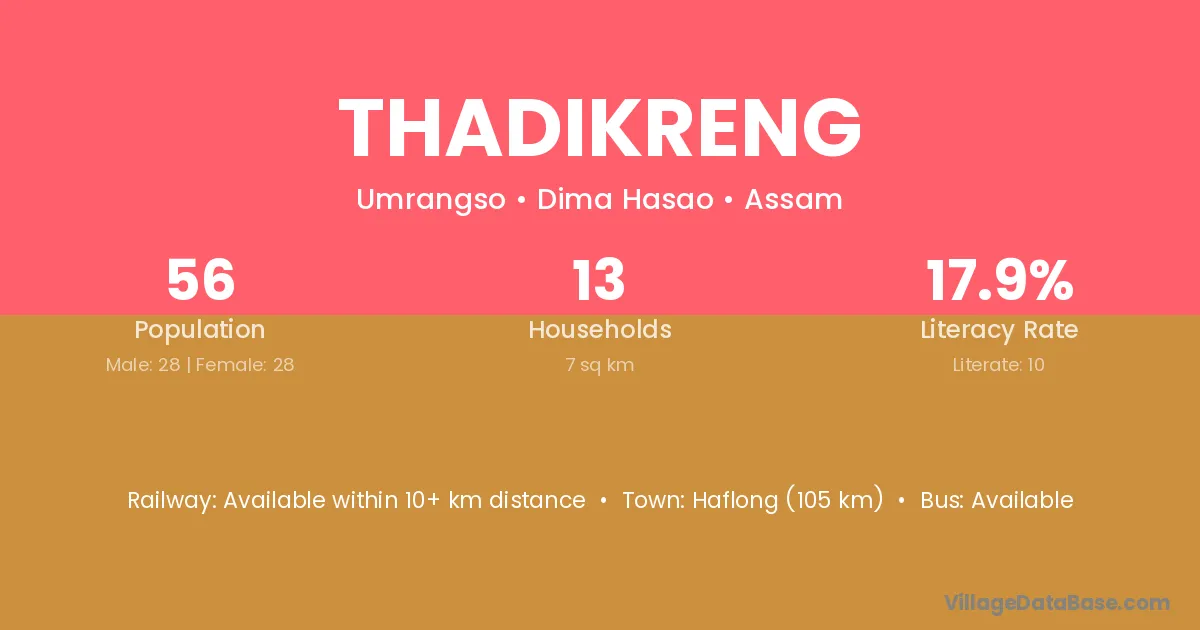 Haflong (105 km) is the nearest town to Thadikreng village for major economic activities and is located approximately 105 km away.