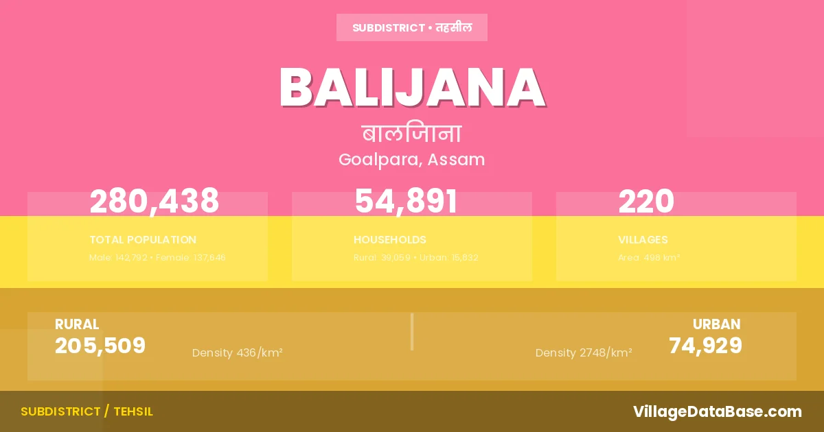 Balijana is a town and Subdivision in the Goalpara district of the Assam. In India, a Subdivision is a subdivision of a district responsible for the administration and revenue collection of a specific area within the district. Subdivisions play a crucial role in the local governance structure, contributing significantly to the development and administration of their communities.