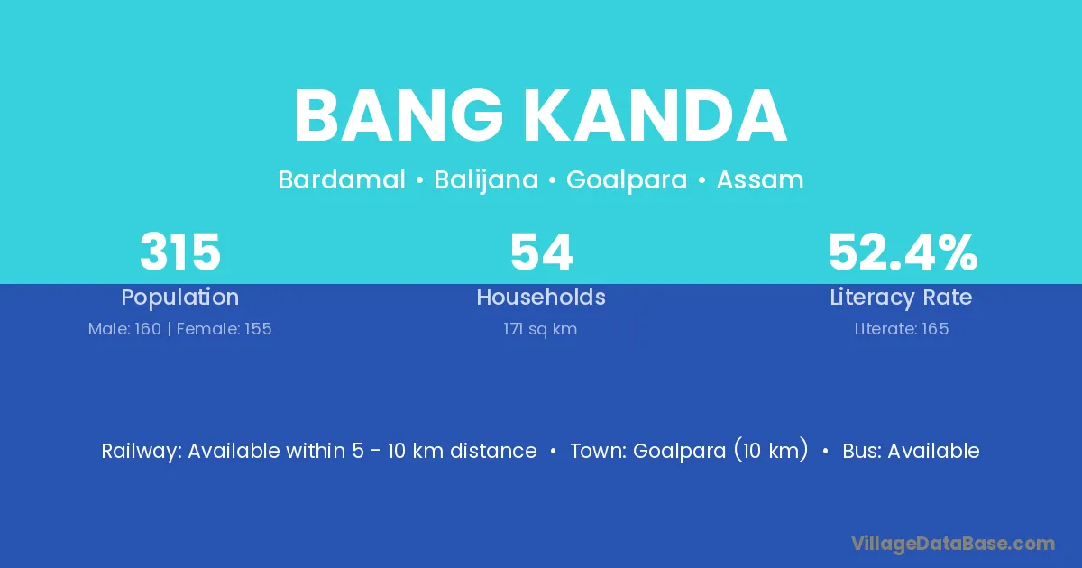 Goalpara (10 km) is the nearest town to Bang Kanda village for major economic activities and is located approximately 10 km away.