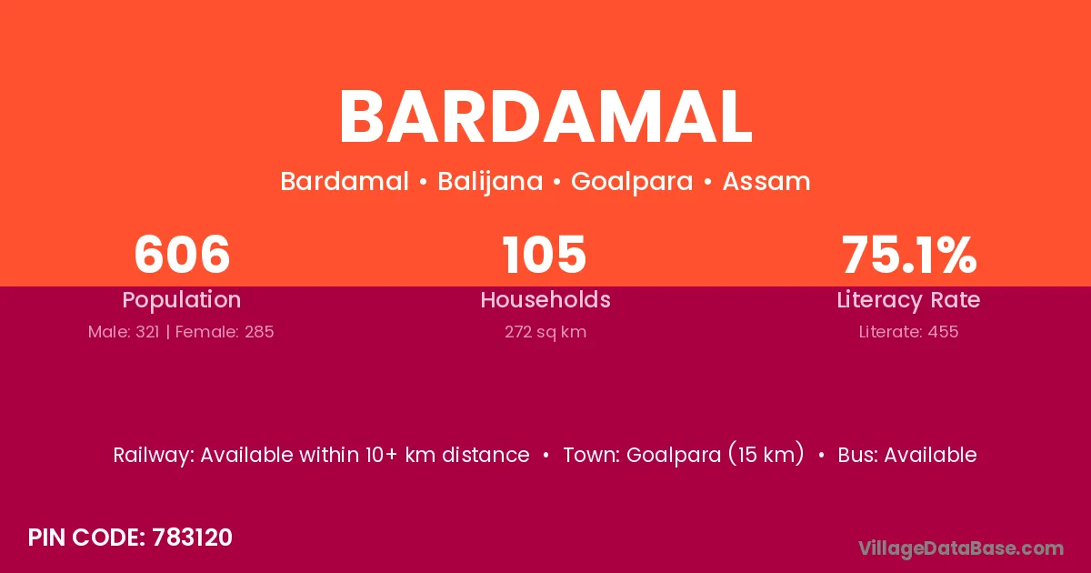 Goalpara (15 km) is the nearest town to Bardamal village for major economic activities and is located approximately 15 km away.
