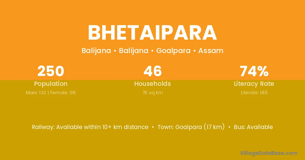Goalpara (17 km) is the nearest town to Bhetaipara village for major economic activities and is located approximately 17 km away.