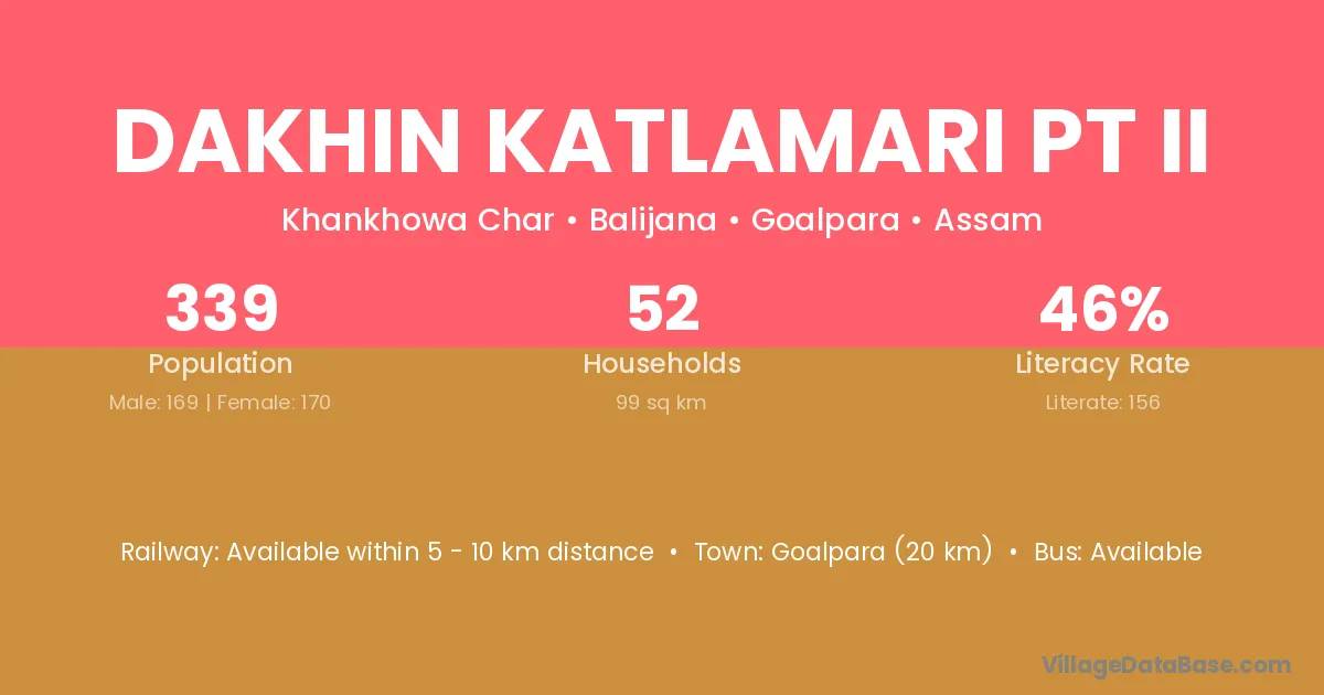 Dakhin Katlamari Pt Ii village has a total population of 339 people, of which 169 are males and 170 are females.