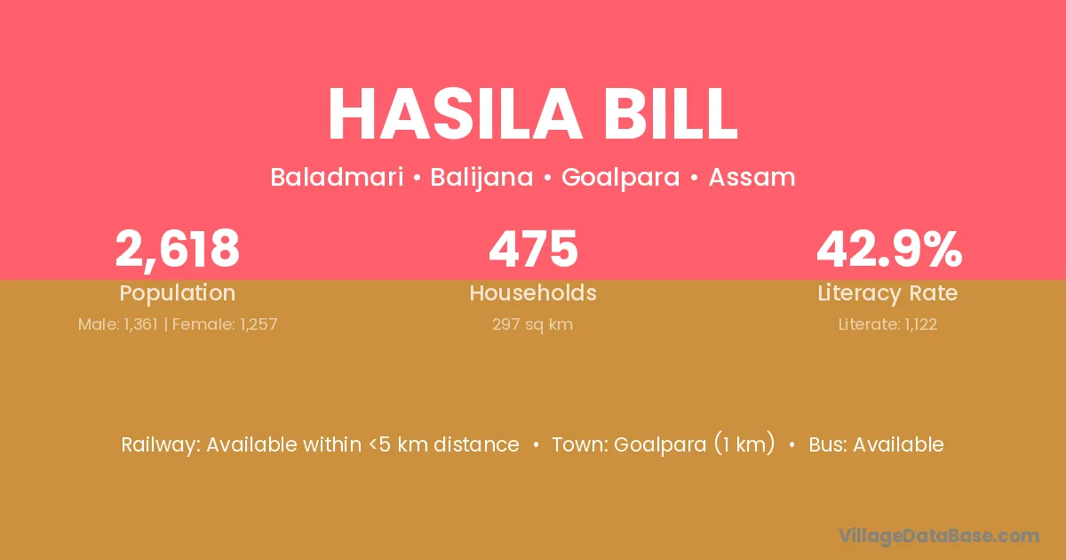 Goalpara (1 km) is the nearest town to Hasila Bill village for major economic activities and is located approximately 1 km away.