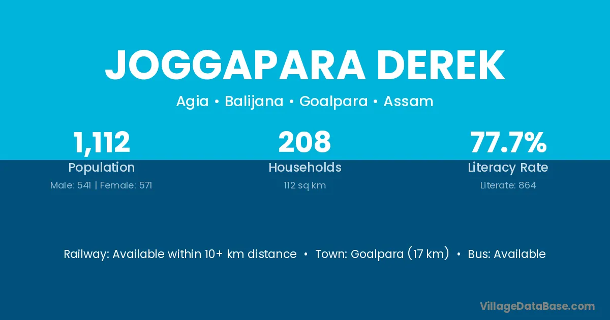 Goalpara (17 km) is the nearest town to Joggapara Derek village for major economic activities and is located approximately 17 km away.