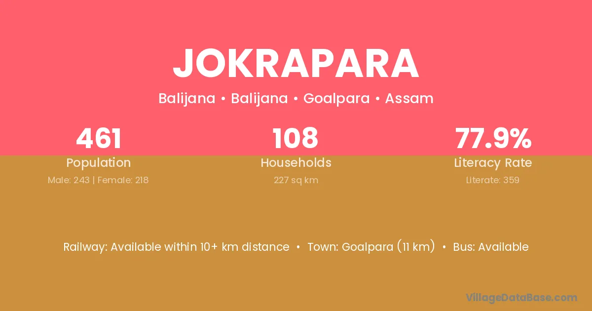Goalpara (11 km) is the nearest town to Jokrapara village for major economic activities and is located approximately 11 km away.