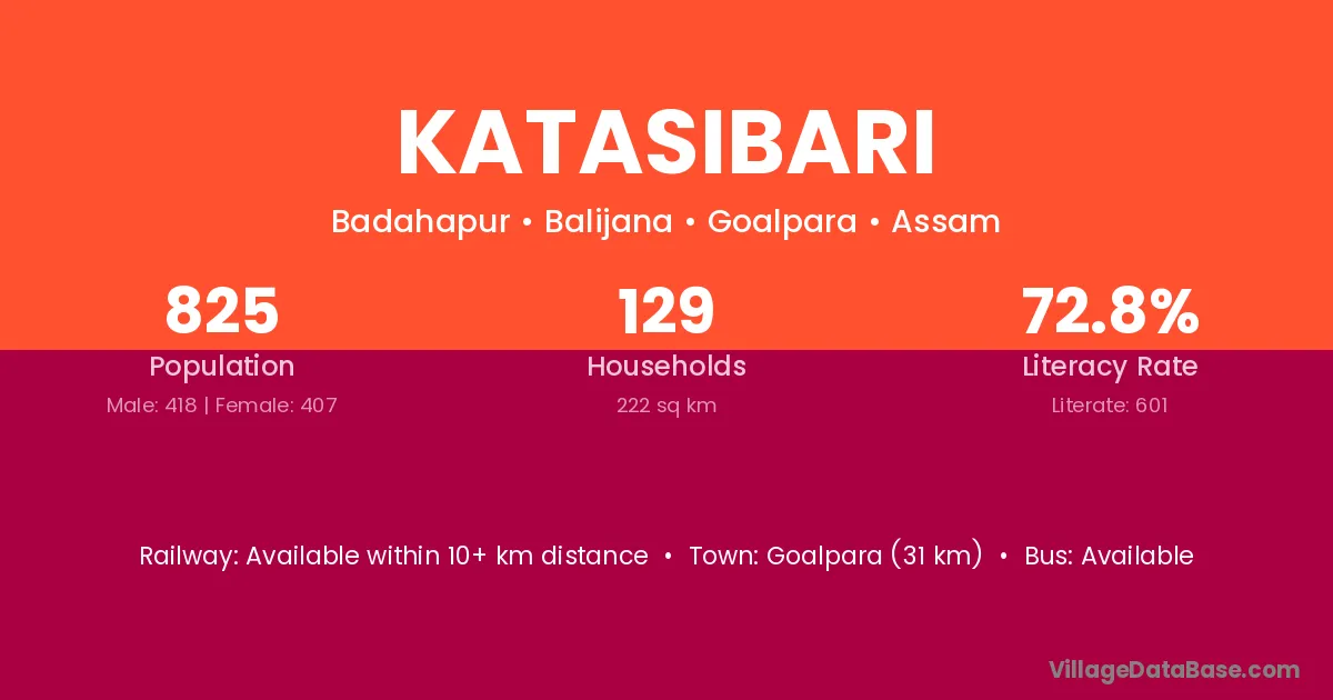 Goalpara (31 km) is the nearest town to Katasibari village for major economic activities and is located approximately 31 km away.
