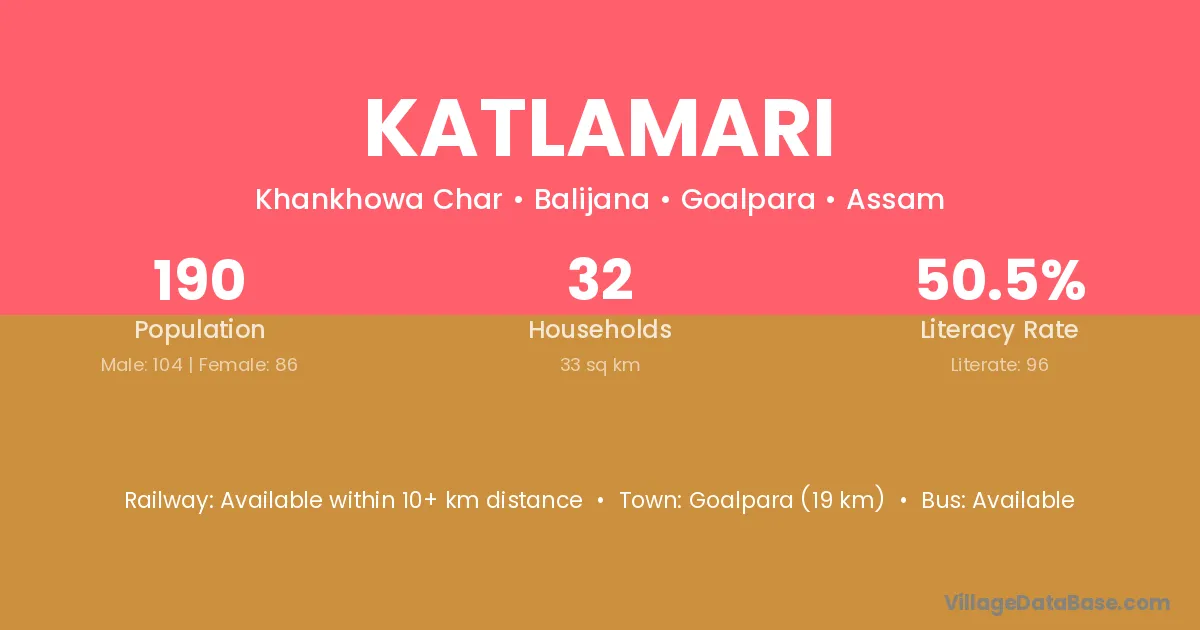 Goalpara (19 km) is the nearest town to Katlamari village for major economic activities and is located approximately 19 km away.