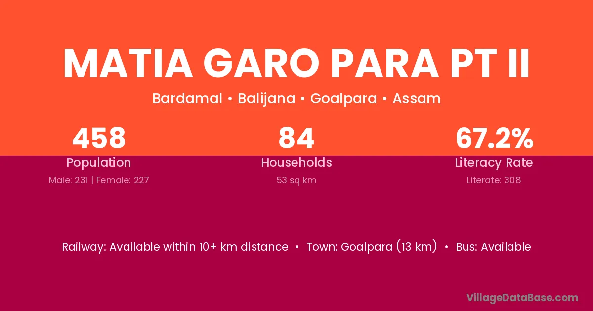 Matia Garo Para Pt Ii village has a total population of 458 people, of which 231 are males and 227 are females.