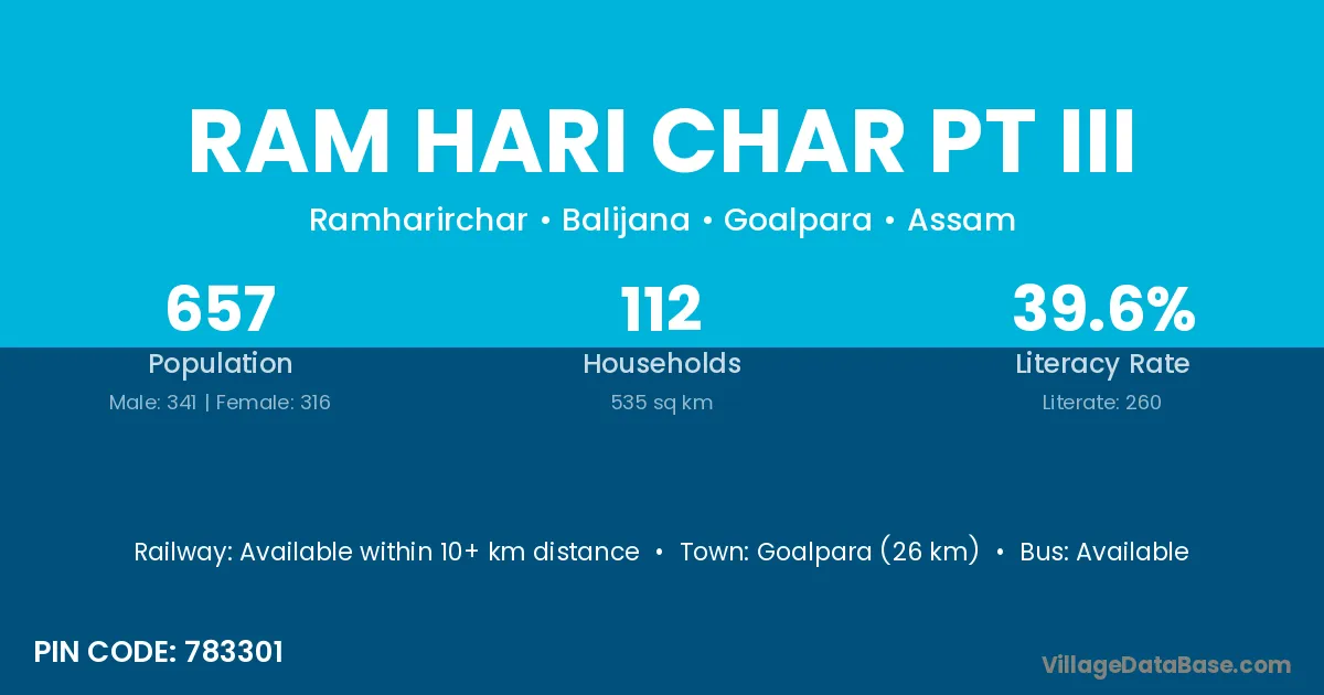 Goalpara (26 km) is the nearest town to Ram Hari Char Pt Iii village for major economic activities and is located approximately 26 km away.