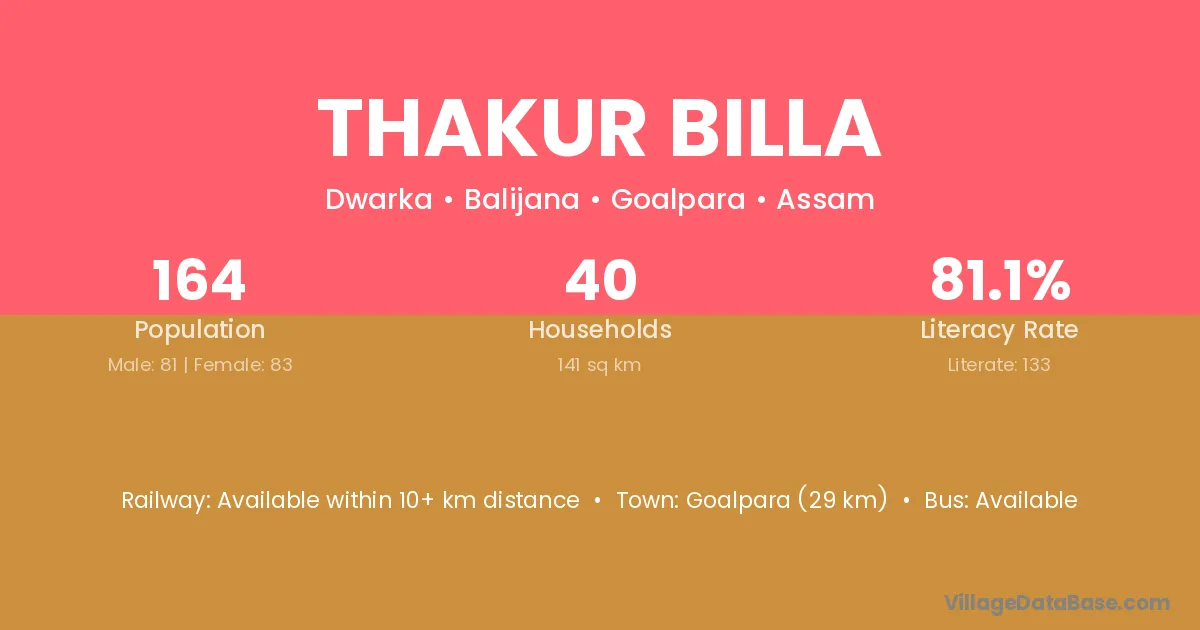 Goalpara (29 km) is the nearest town to Thakur Billa village for major economic activities and is located approximately 29 km away.