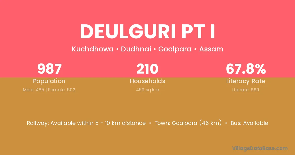 Goalpara (46 km) is the nearest town to Deulguri Pt I village for major economic activities and is located approximately 46 km away.