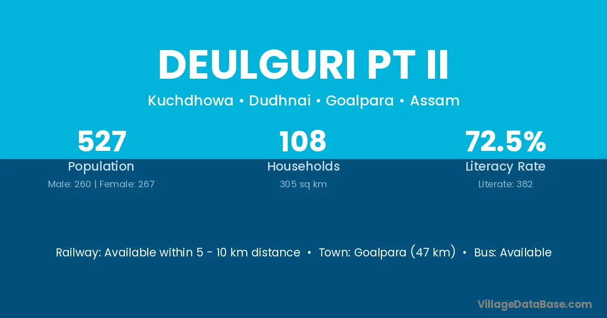Goalpara (47 km) is the nearest town to Deulguri Pt Ii village for major economic activities and is located approximately 47 km away.