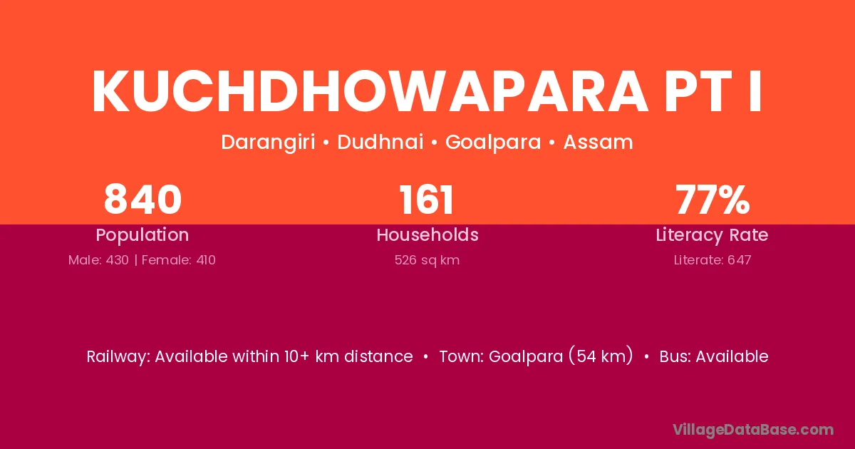 Goalpara (54 km) is the nearest town to Kuchdhowapara Pt I village for major economic activities and is located approximately 54 km away.