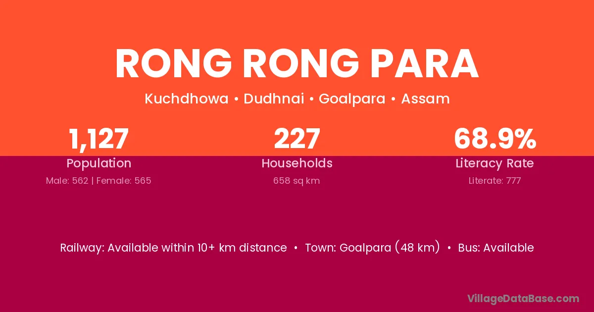 Goalpara (48 km) is the nearest town to Rong Rong Para village for major economic activities and is located approximately 48 km away.