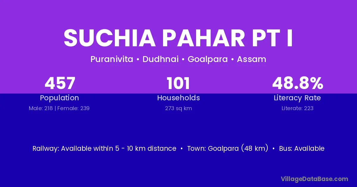 Goalpara (48 km) is the nearest town to Suchia Pahar Pt I village for major economic activities and is located approximately 48 km away.