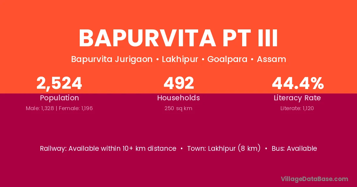 Lakhipur (8 km) is the nearest town to Bapurvita Pt Iii village for major economic activities and is located approximately 8 km away.