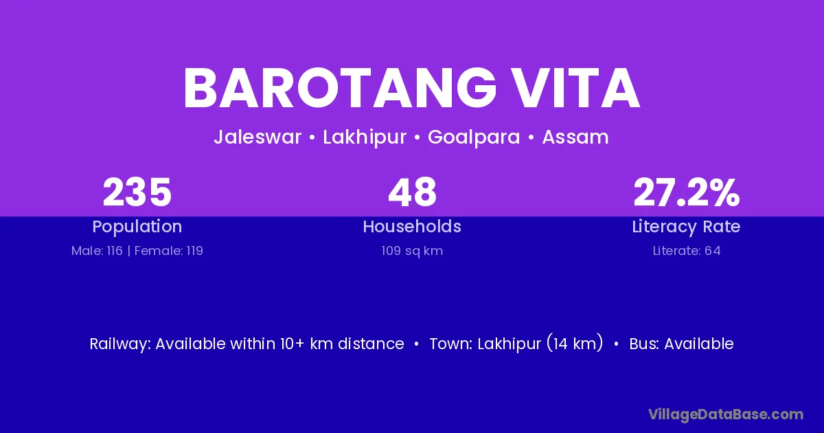 Lakhipur (14 km) is the nearest town to Barotang Vita village for major economic activities and is located approximately 14 km away.