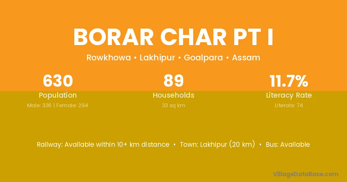 Lakhipur (20 km) is the nearest town to Borar Char Pt I village for major economic activities and is located approximately 20 km away.
