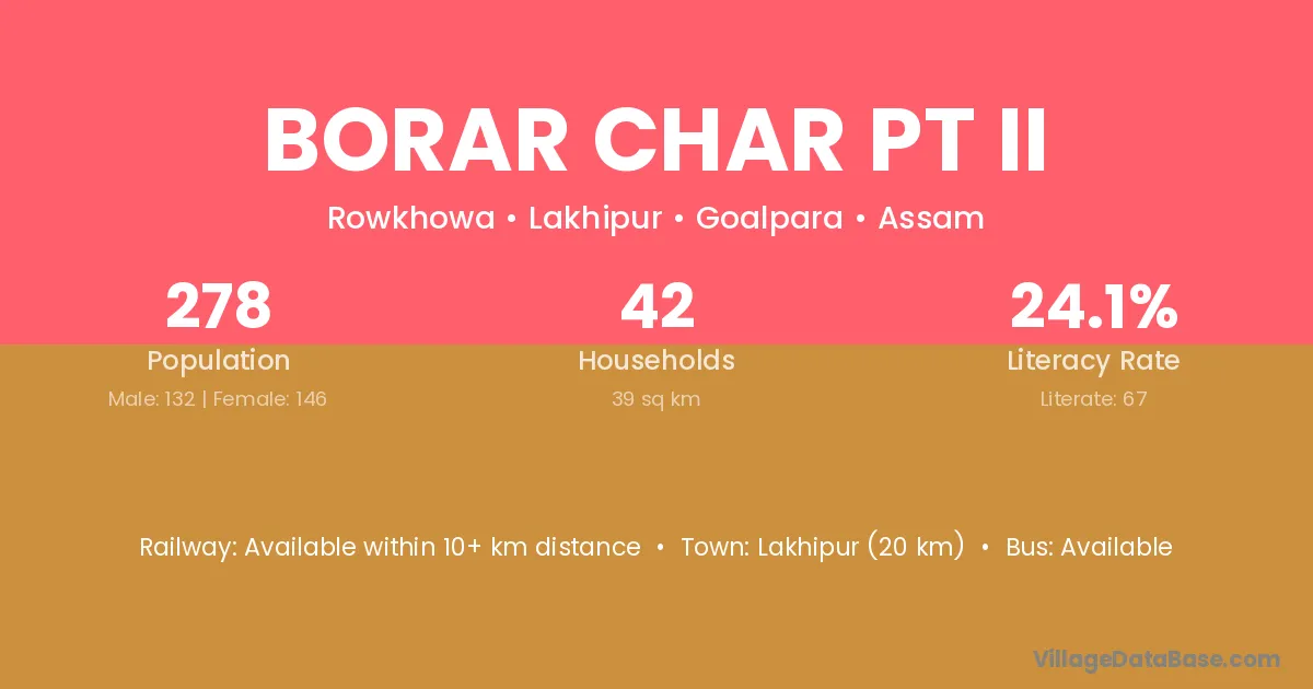 Lakhipur (20 km) is the nearest town to Borar Char Pt Ii village for major economic activities and is located approximately 20 km away.