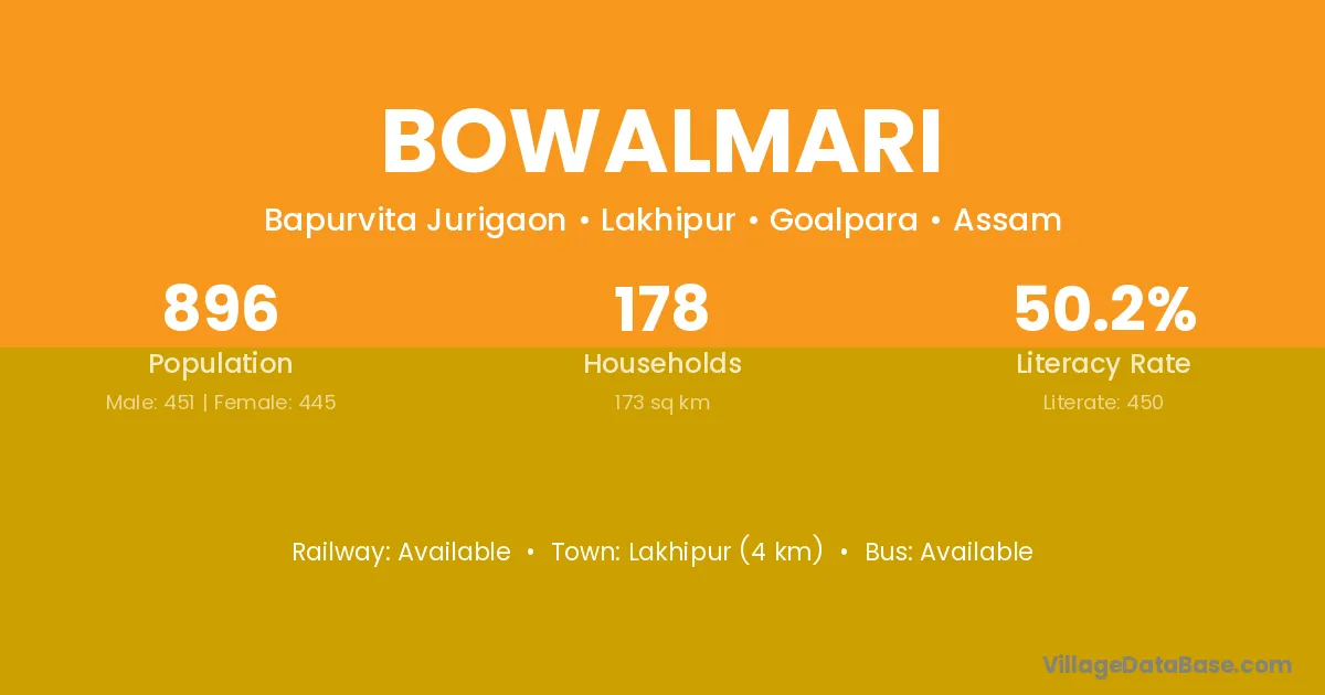 Bowalmari village has a total population of 896 people, of which 451 are males and 445 are females.