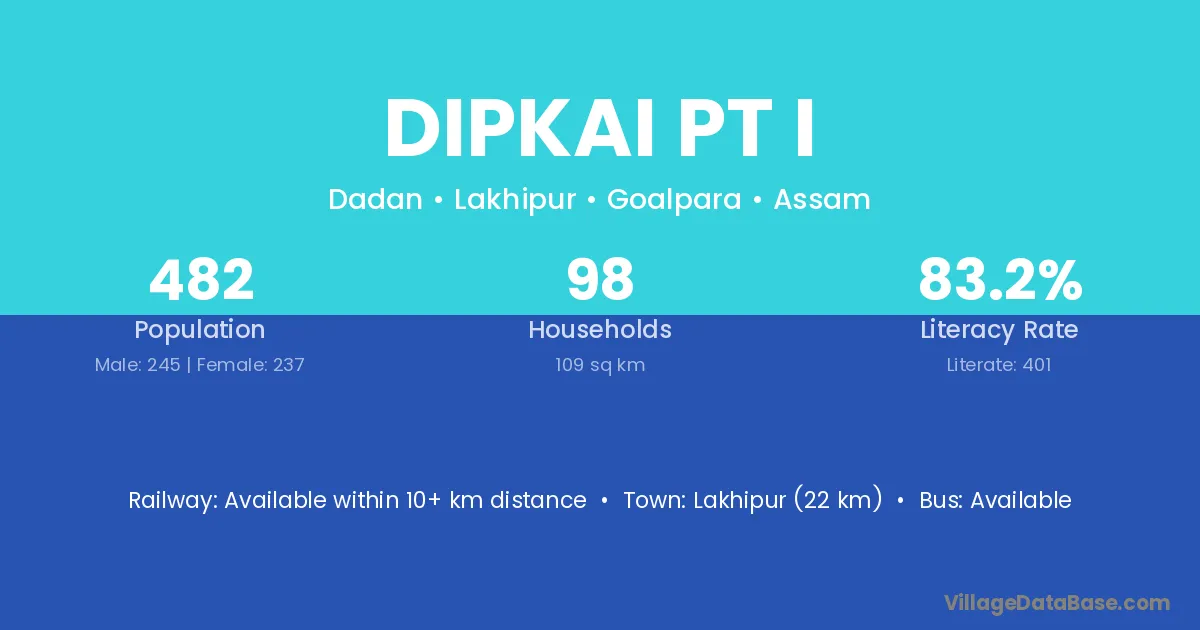 Lakhipur (22 km) is the nearest town to Dipkai Pt I village for major economic activities and is located approximately 22 km away.