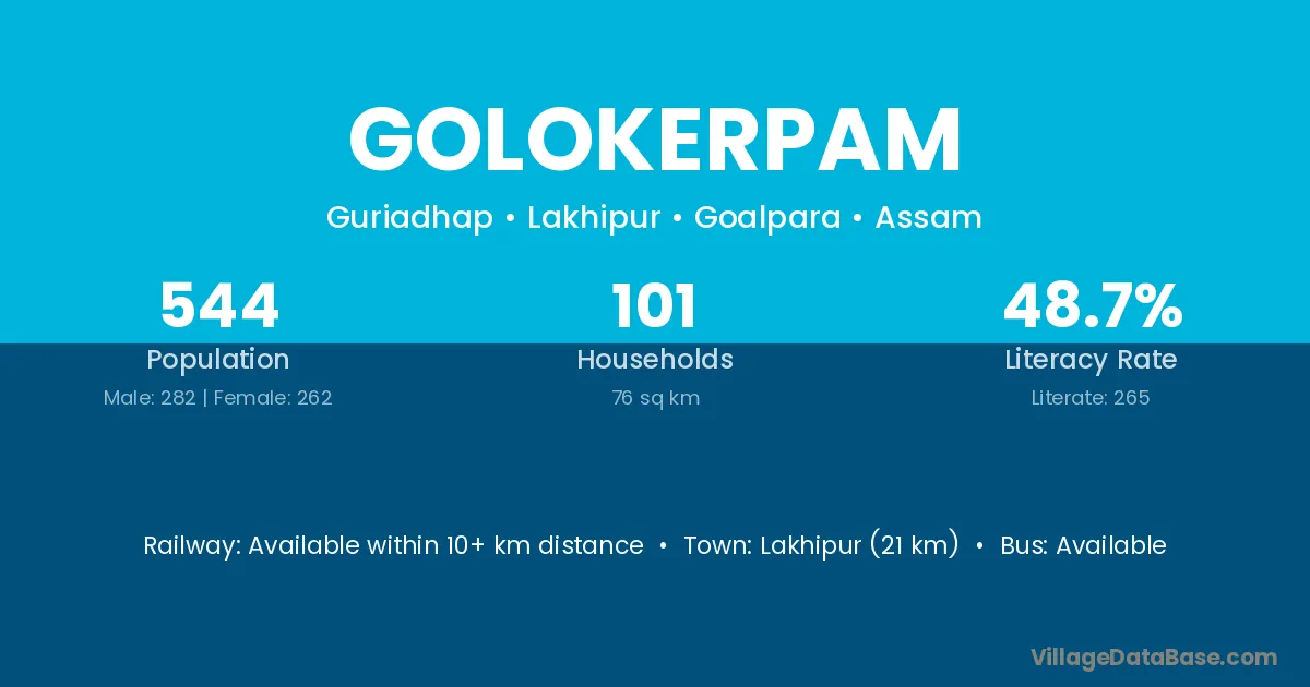 Lakhipur (21 km) is the nearest town to Golokerpam village for major economic activities and is located approximately 21 km away.