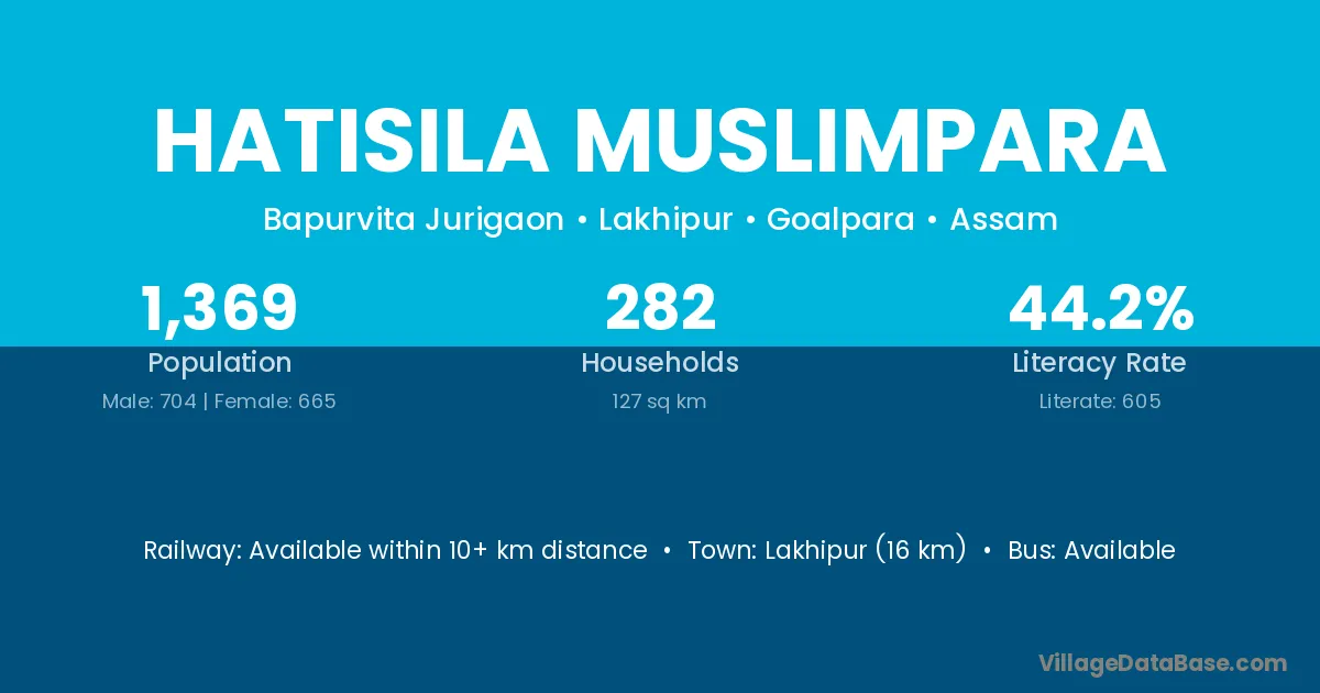 Lakhipur (16 km) is the nearest town to Hatisila Muslimpara village for major economic activities and is located approximately 16 km away.