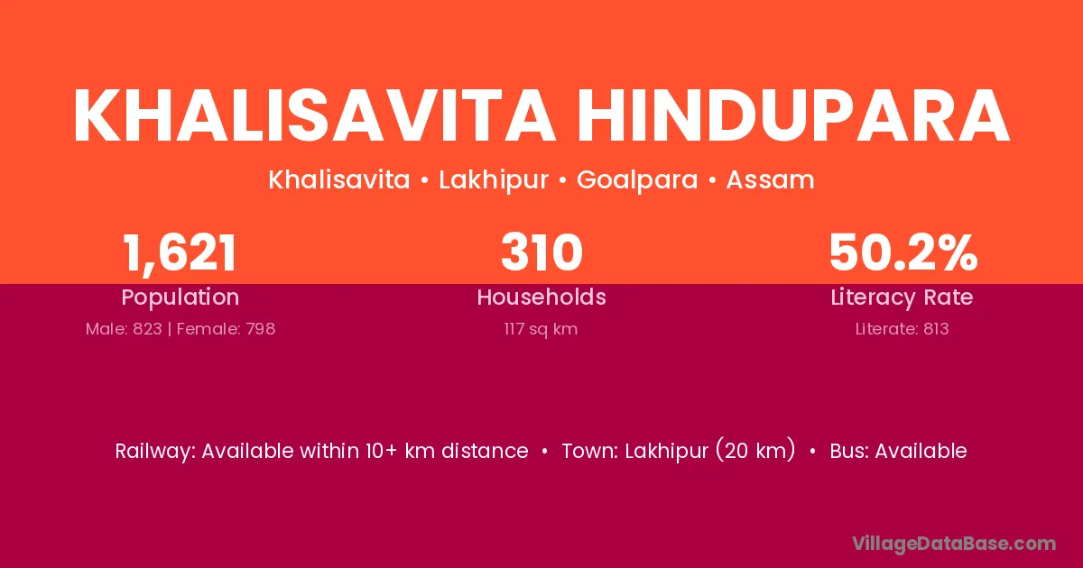 Lakhipur (20 km) is the nearest town to Khalisavita Hindupara village for major economic activities and is located approximately 20 km away.