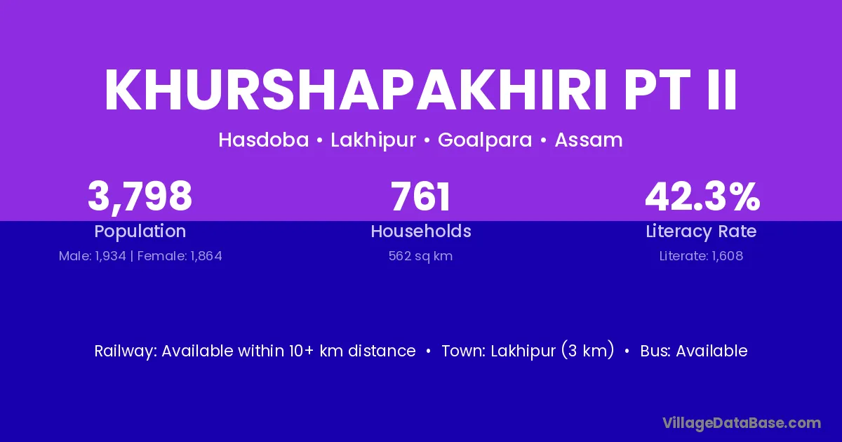 Lakhipur (3 km) is the nearest town to Khurshapakhiri Pt Ii village for major economic activities and is located approximately 3 km away.