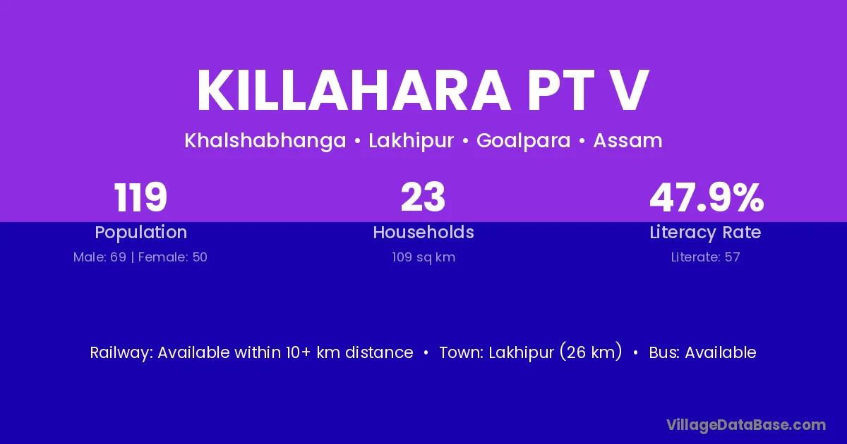 Lakhipur (26 km) is the nearest town to Killahara Pt V village for major economic activities and is located approximately 26 km away.